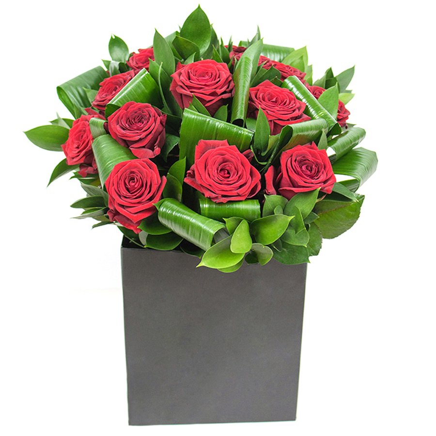 Enhance your home with our sophisticated bouquet, showcasing vivid red roses intertwined with aspidistra leaves and ruscus. This arrangement is meticulously designed to offer a blend of beauty and uniqueness that stands out.